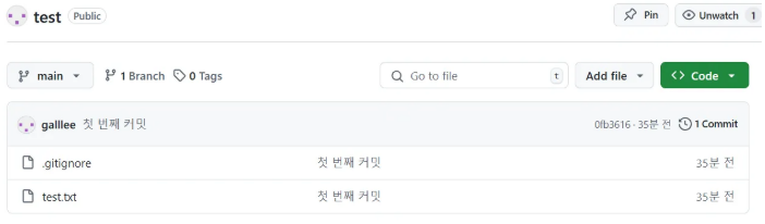 내가 현재 작업중인 폴더를 galllee/test.git이라는 원격 레포지토리에 연결함