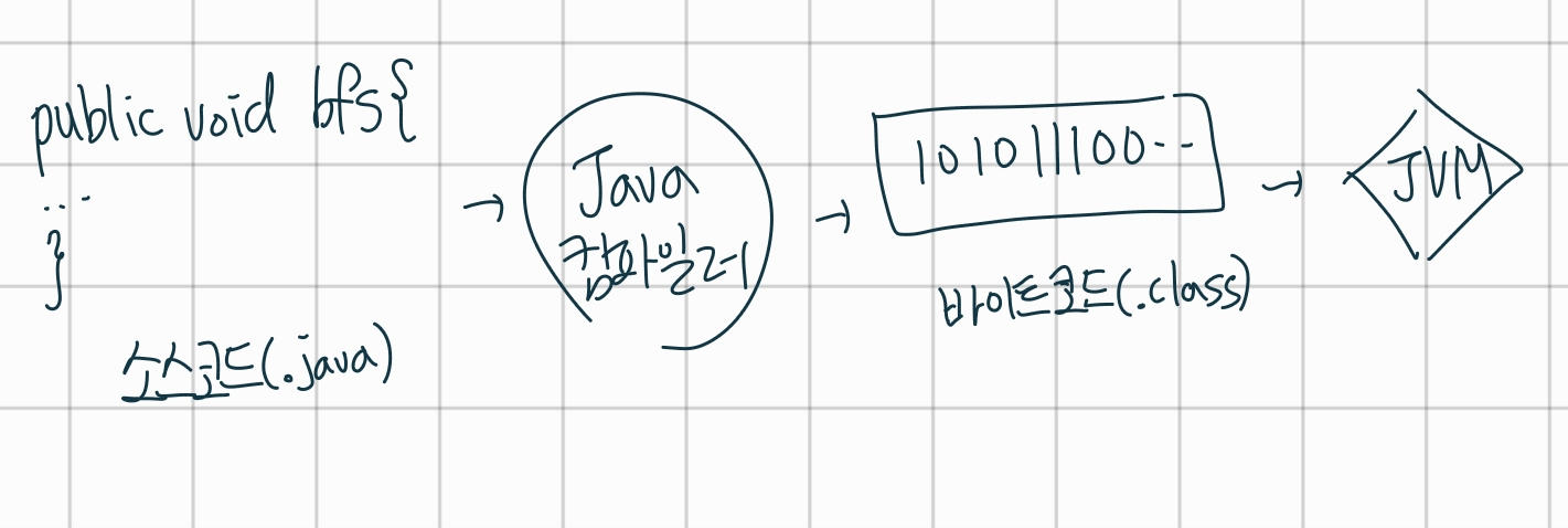 Java는 어떻게 동작하는 언어인가?인간의 언어로 만들어진 소스코드(.java 파일)를 컴퓨터가 알아들을 수 있는 형태(1010...의 디지털 코드)로 변환해야 함.Java 컴파일러가 나의 소스코드를 바이트 코드(.class 파일)로 변환한 후, JVM에 올려 자바 프로그램을 실행한다.*컴파일: 인간의 언어를 기계어로 번역하는 과정 JVM이란? Java Virtual Machine (자바 가상머신)- 자바 프로그램이 실행되는 가상의 공간- OS별로 존재- 바이너리 코드를 읽고 검증하고 실행- 운영체제와 관계 없이 JVM이 구성되어 있는 곳에서는 모든 곳에서 동일한 코드로 작성된 Java 프로그램을 실행할 수 있다.- 자바가 등장하기 전에는 운영체제 별로 소스를 바꾸어야 했다. - 자바가 등장하면서, 한 ..